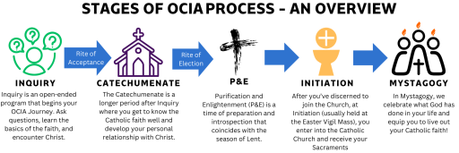 The full OCIA journey consists of four periods of awakening, growth and formation marked by celebration of three major rites (steps) involving the whole St. Mark community.